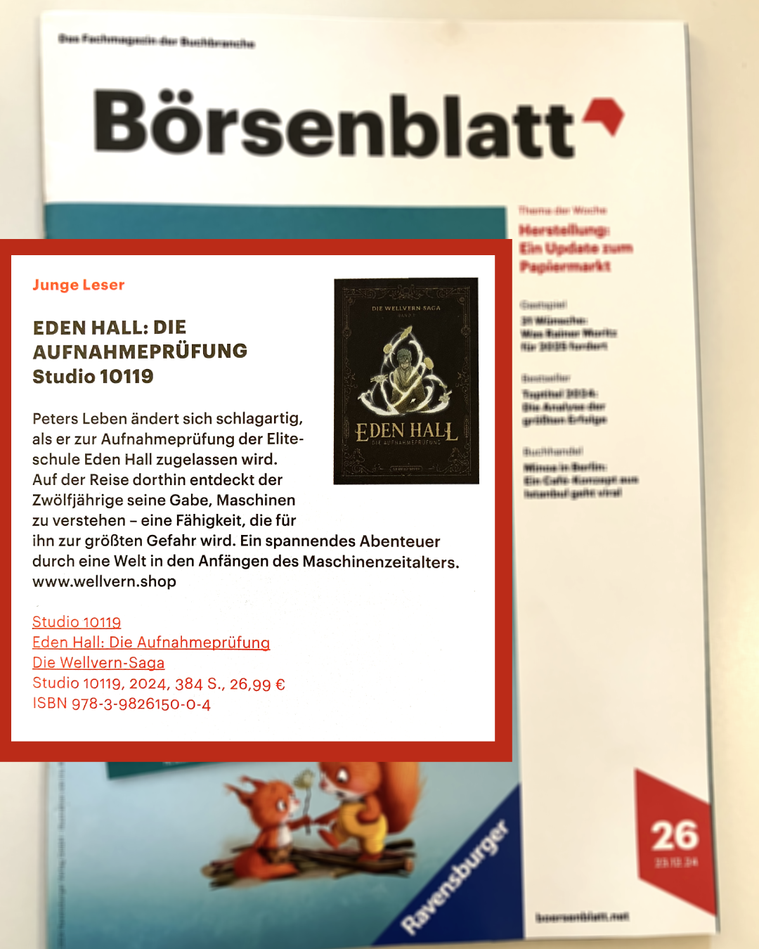 Es ist der Fantasyroman des Jahres. Mit „Eden Hall: Die Aufnahmeprüfung“, dem ersten Band der neuen Wellvern-Saga, erfindet das Berliner Studio 10119 das klassische Fantasy-Genre neu und greift eines der interessantesten aktuellen Themen unserer Zeit auf: das viel diskutierte Spannungsfeld von Mensch und Maschine. Wie beeinflussen uns Technologien seit jeher?